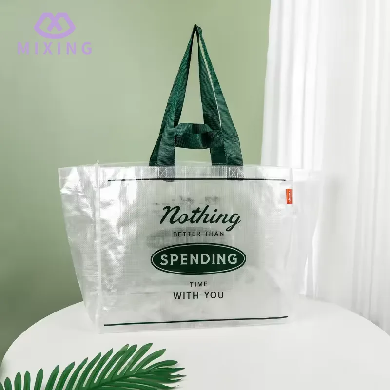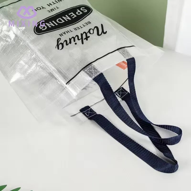 Håndbæredelen af Mixing 's China Clear PP Woven Tote Bag er designet med en udvidet nylonrem, nylonmaterialet har en moderat blødhed og efterlader ikke mærker, når det kommer i kontakt med hånden. Den bærende ydeevne er blevet testet mange gange og kan støtte stabilt uden deformation.